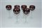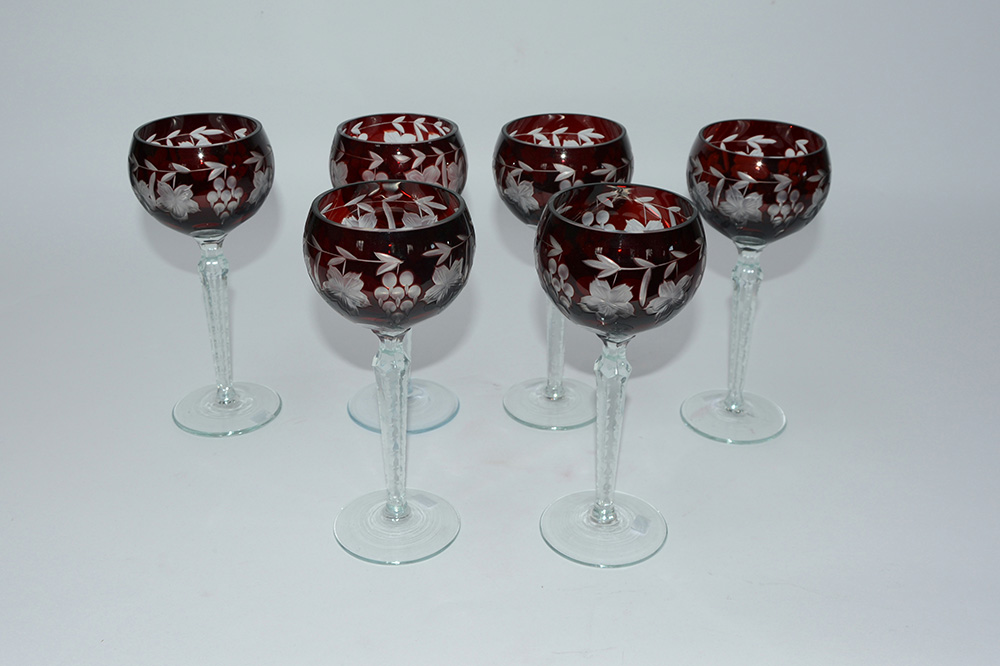 Manifattura di Boemia, gruppo di sei bicchieri a calice in cristallo color vinaccia molato a fiori e grappoli (h cm 21)