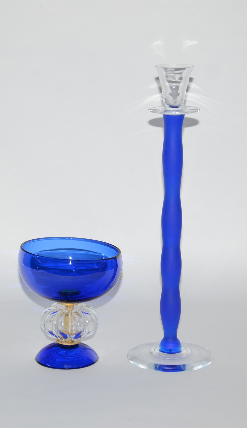 Lotto composto da un'alzatina e un candeliere in vetro blu e incolore di misure diverse