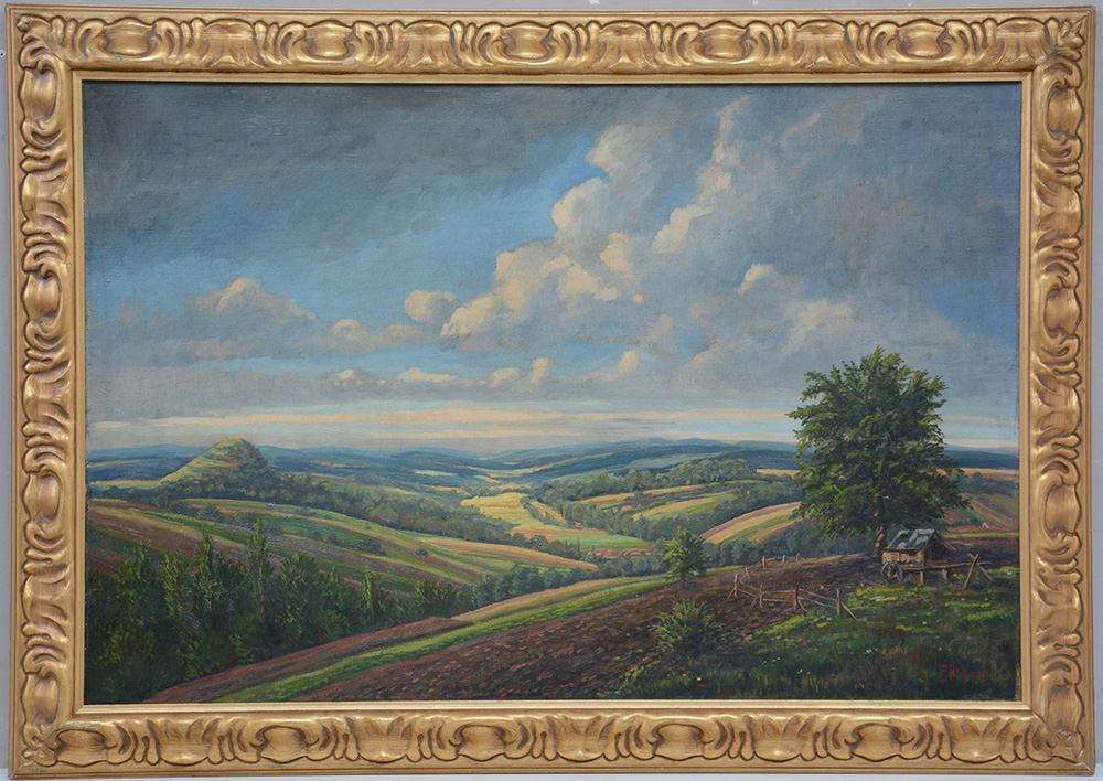 Ignoto "Paesaggio collinare" olio su tela (cm 60x90) reca firma F.R. Koch in basso a destra (difetti)