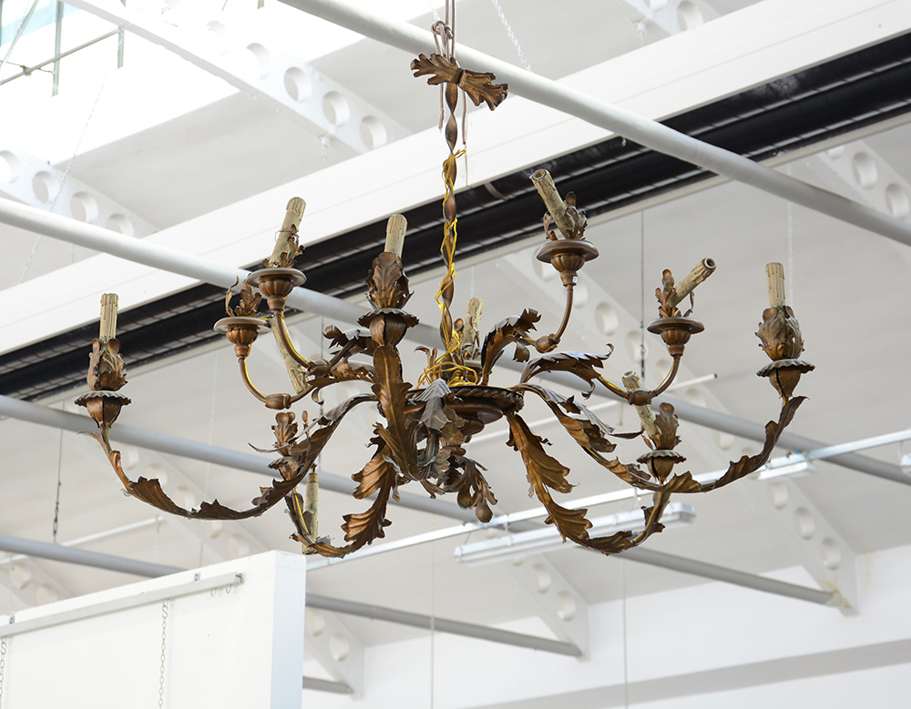 Lampadario a dieci luci in legno e metallo sbalzato a motivi vegetali (h cm 95) (difetti)