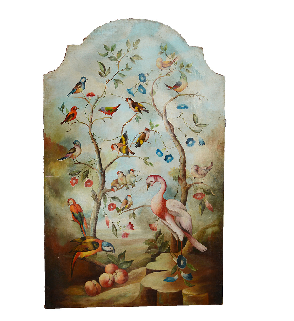 Ignoto "Uccelli su rami fioriti" antico dipinto ad olio su tela sagomata (cm 162x100) (difetti)