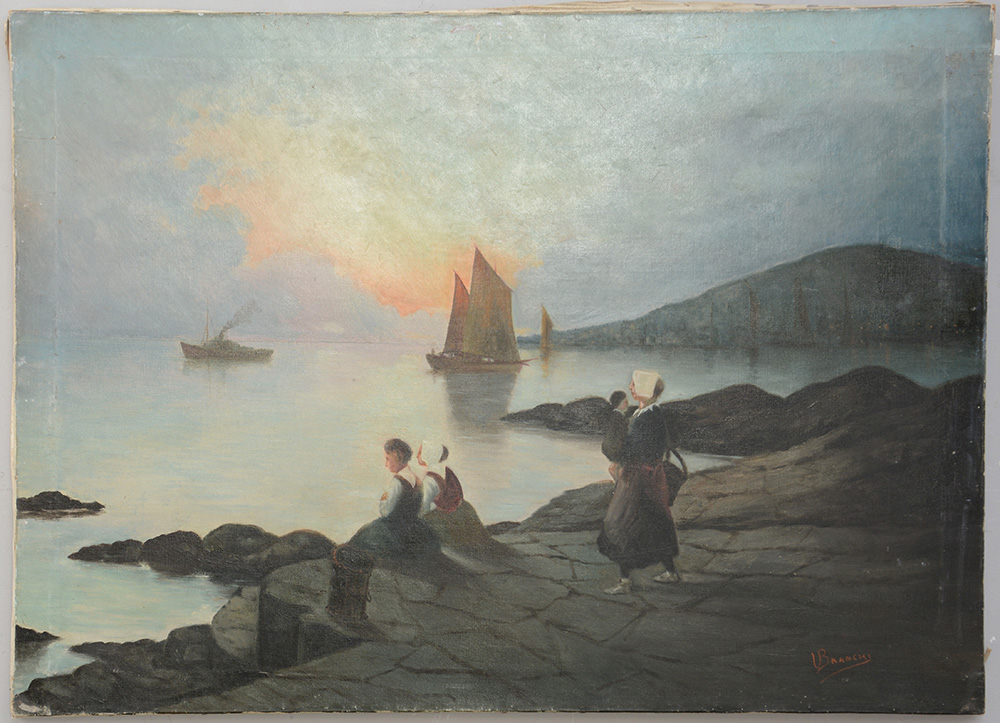 Ignoto "L'attesa dal ritorno dalla pesca" olio su tela (cm 80x110) firmato Branchi in basso a destra (difetti)