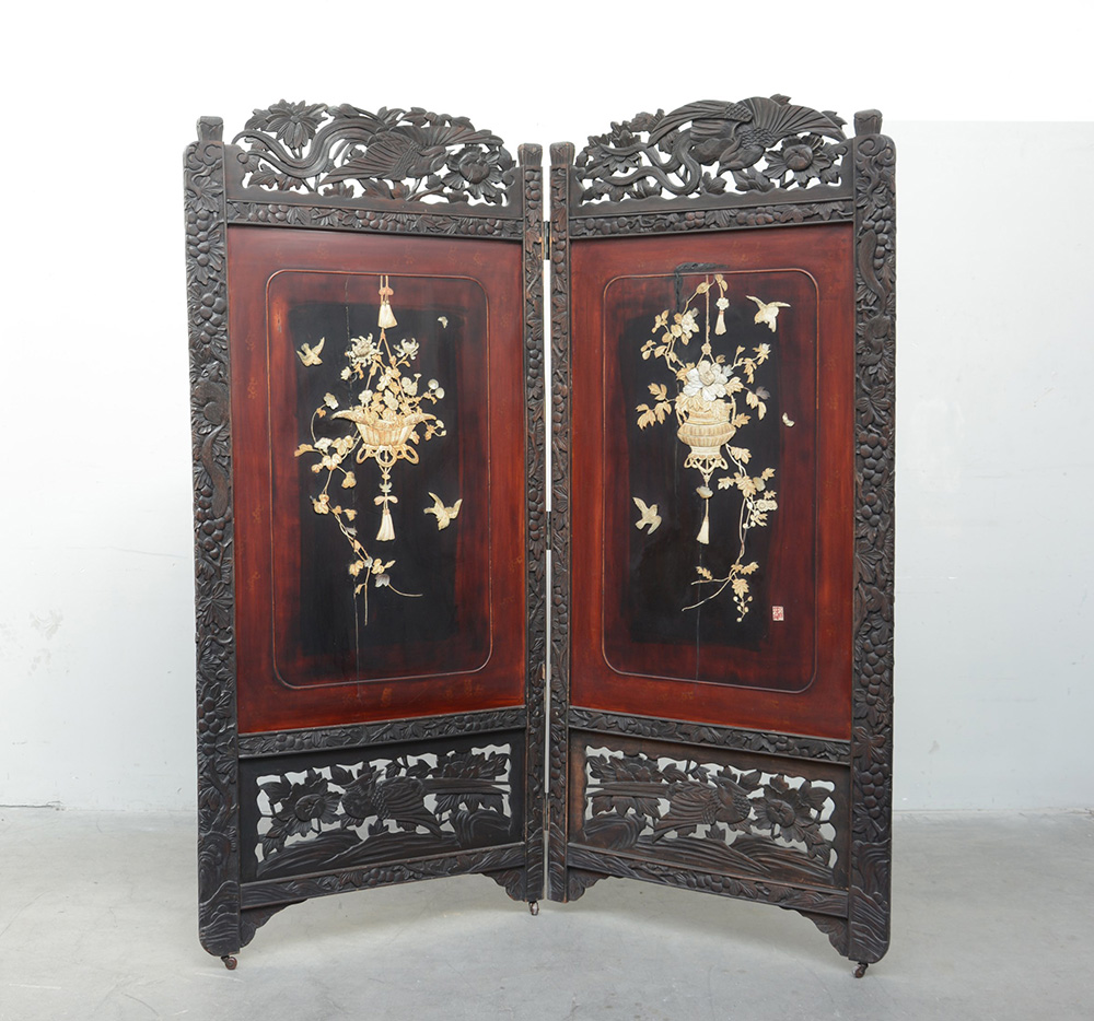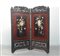 Paravento a due ante in legno laccato e dipinto intarsiato con elementi in...