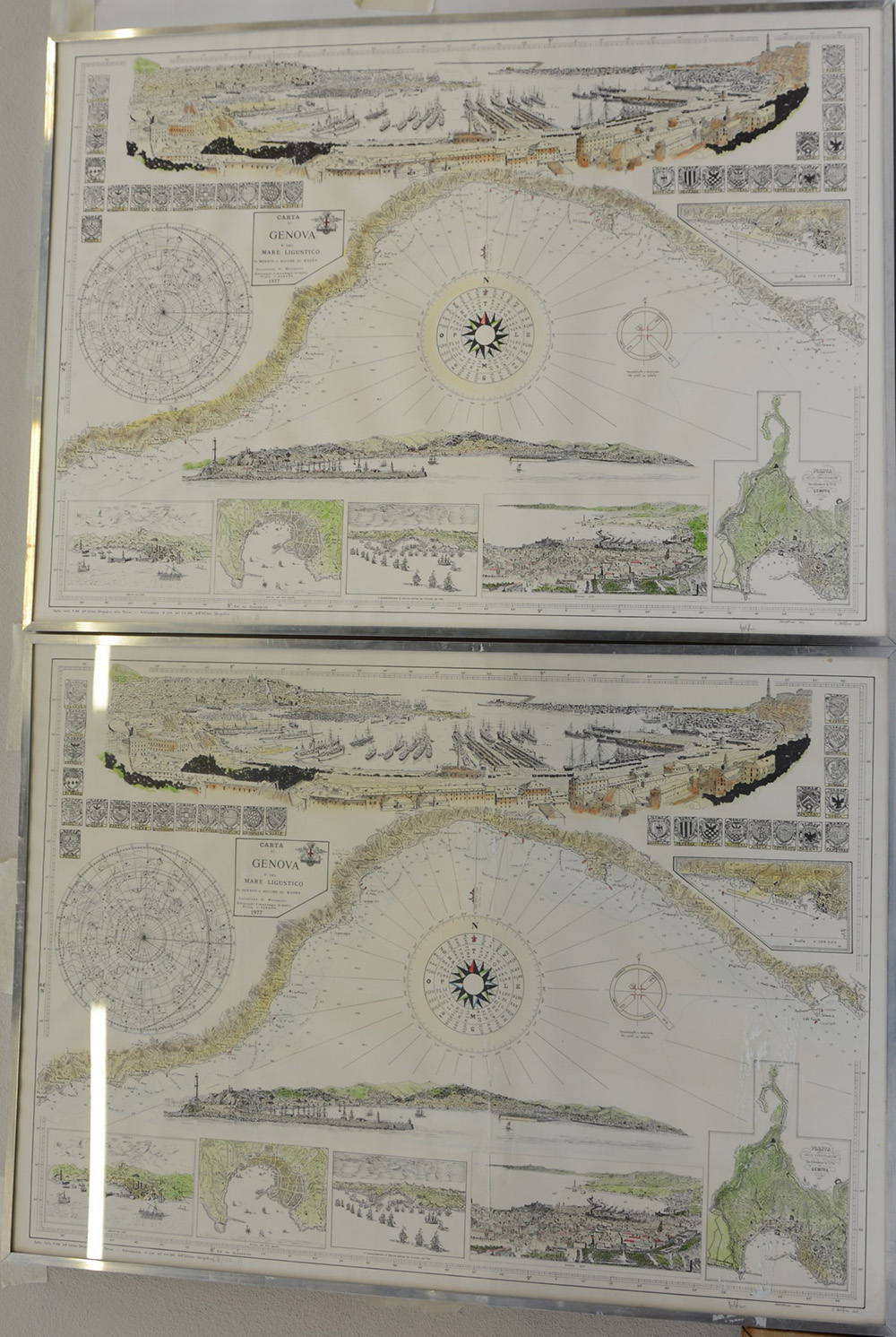 Lotto di due coppie di stampe moderne a colori raffiguranti carte nautiche della città di Genova e della Sardegna. In cornici (difetti).