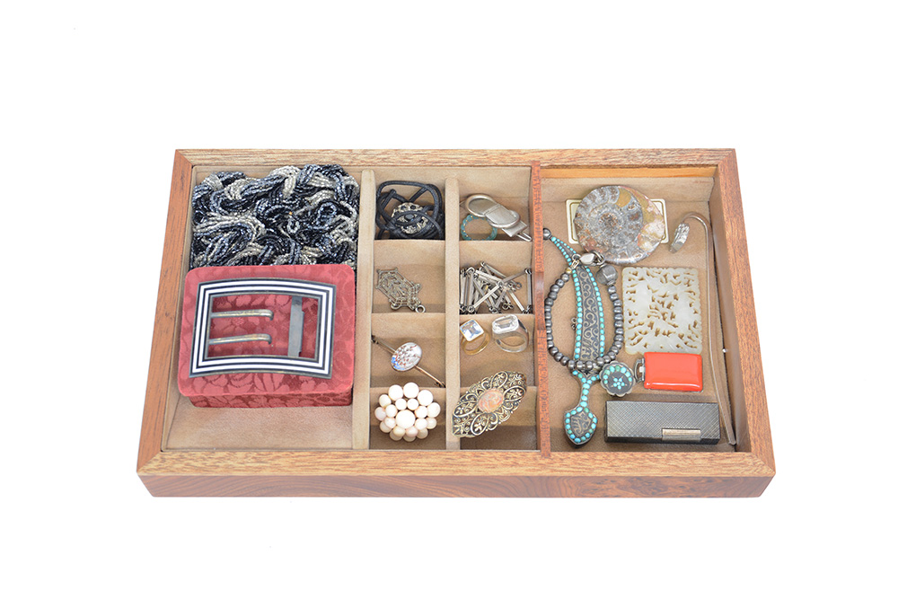 Scatola portagioie in legno con numerosi bijoux di differenti usi e fatture...