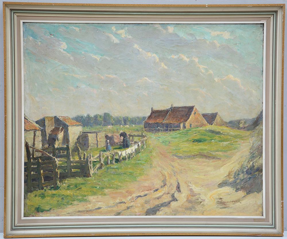Ignoto "Paesaggio con casolare e contadina" olio su tela (cm 65x80) reca firma L. Haeck in basso a destra, in cornice (difetti)