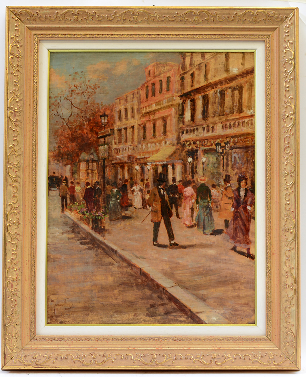 Firma indecifrata "Scorciodi Parigi con figure" olio su compensato. Firmato in basso a sinistra (cm 62x47) In cornice