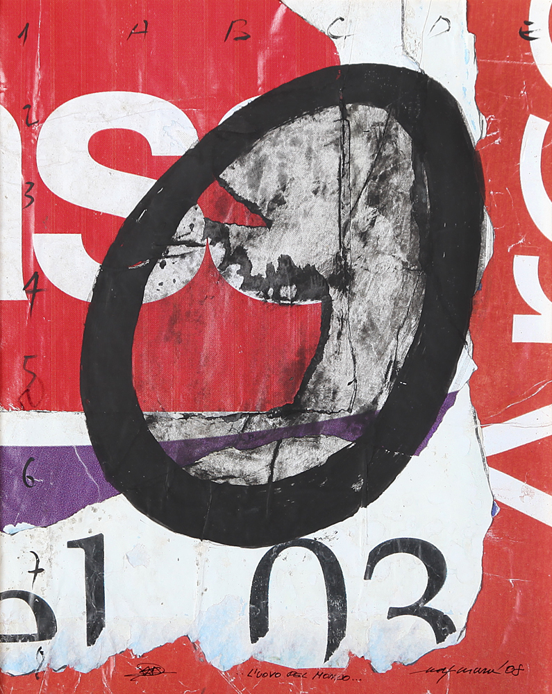 MAX MARRA Paola 28/07/1950 - L'uovo del mondo, 2008, frammenti di manifesto e acrilico su cartone cm. 50x40, titolo in basso al centro, firma e anno in basso a destra, firma, titolo, anno e scritta "Omaggio al Maestro Mimmo Rotella Monaco Zen" al retro, dichiarazione d'autenticità dell'artista su foto.