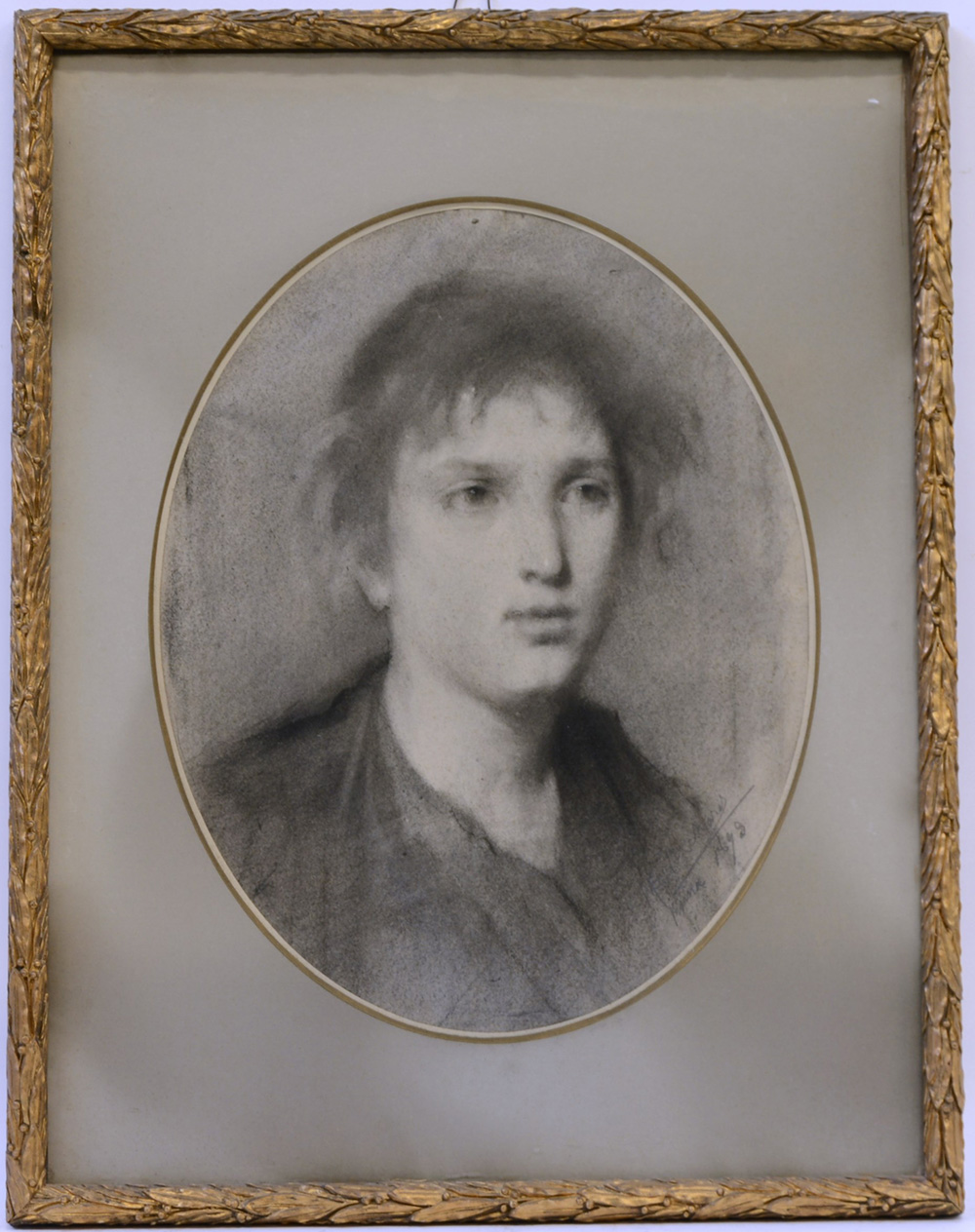 Ignoto della fine del secolo XIX "Ritratto femminile" 1898 disegno a carboncino su carta ovale (cm 46x36) reca firma indecifrata e data in basso a sinistra, in cornice (difetti)
