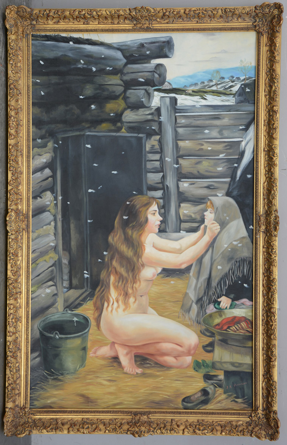 Ignoto "Amore materno" 1939 olio su tela (cm 130x78) reca firma indecifrata e datata in basso a destra, in cornice (difetti)