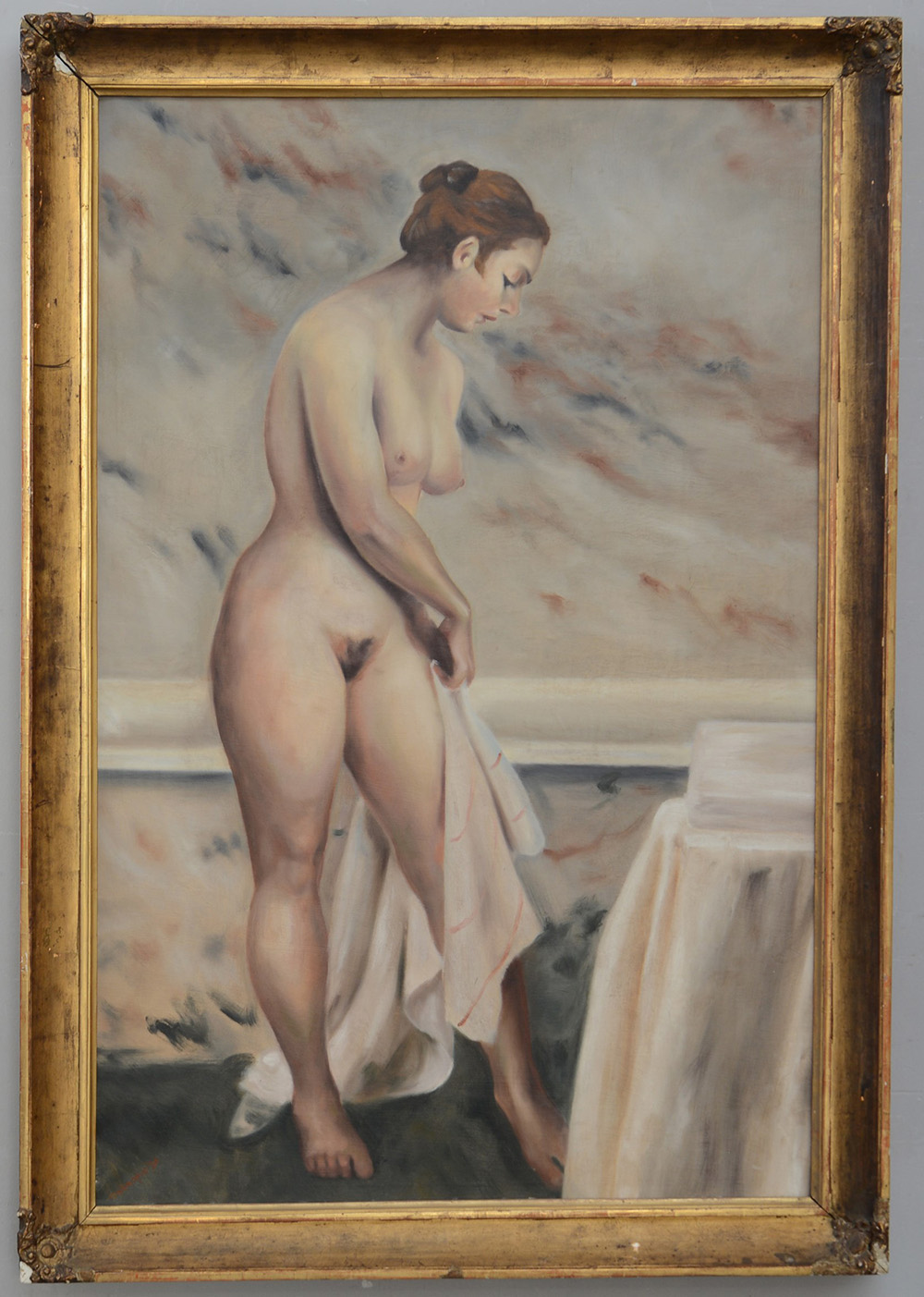 Ignoto sec XX. "Nudo femminile" olio su tela (cm 122x82) reca firma indecifrata in basso a sinistra, in cornice (difetti e mancanze)