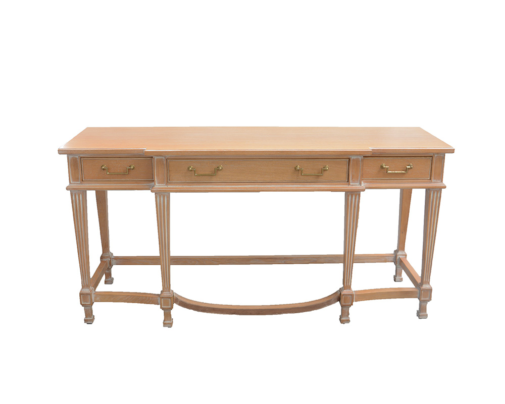 Consolle in legno chiaro con fronte sagomato, tre cassetti sottopiano e sei gambe rastremate e scanalate (cm 160x81x50) (lievi difetti)