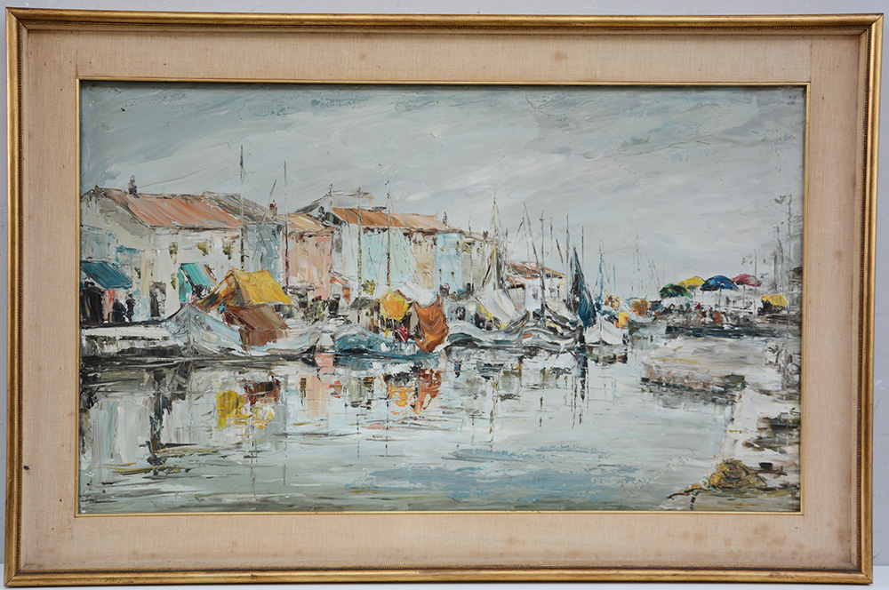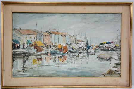 Renata Gualtieri "Cesenatico. Scorcio porto canale", olio materico su tela (cm 60x100) firmato in basso a destra, titolato, firlato e datato 1965 al verso, in cornice (difetti)