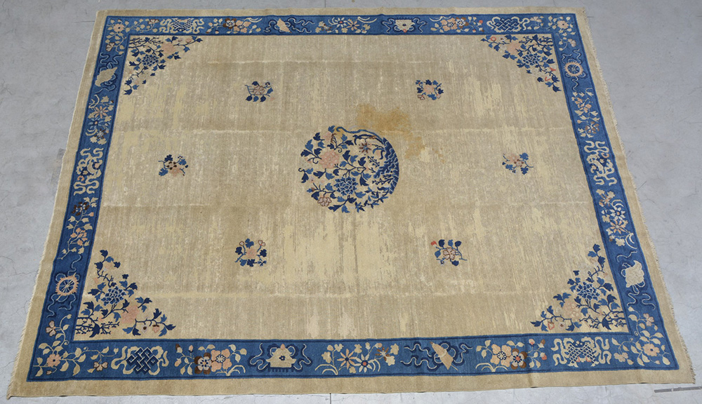 Tappeto Cina a fondo beige decorato con medaglione centrale e motivi vegetali (cm 348x280) (gravi difetti e restauri)