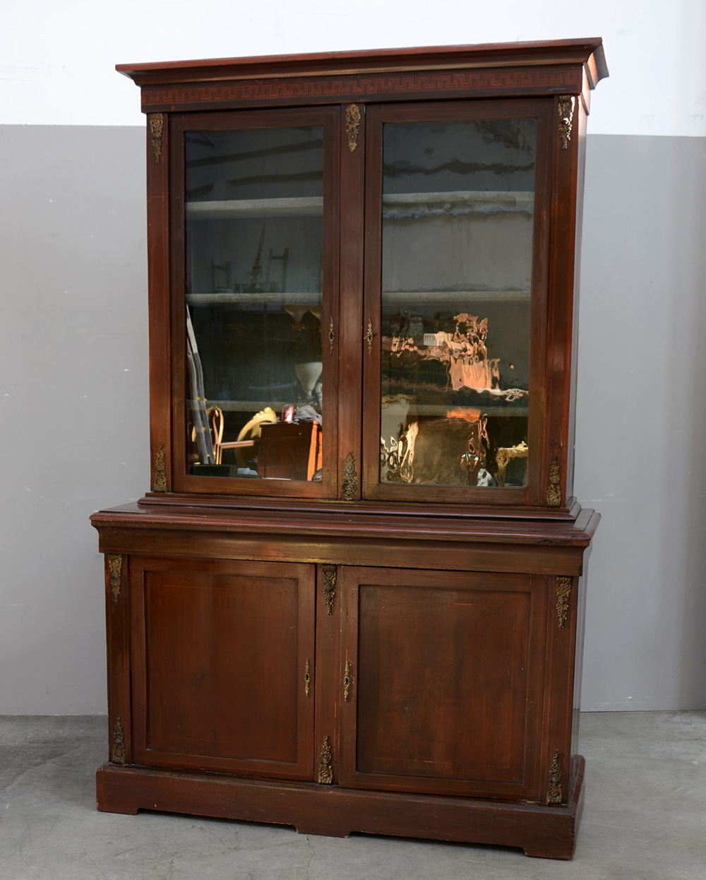Libreria a due corpi lastronata in mogano composta da un mobile a due sportelli ed una alzata a vetrina, decorata da filettature, greche e applicazioni in bronzo (cm 136x209x49) (difetti)