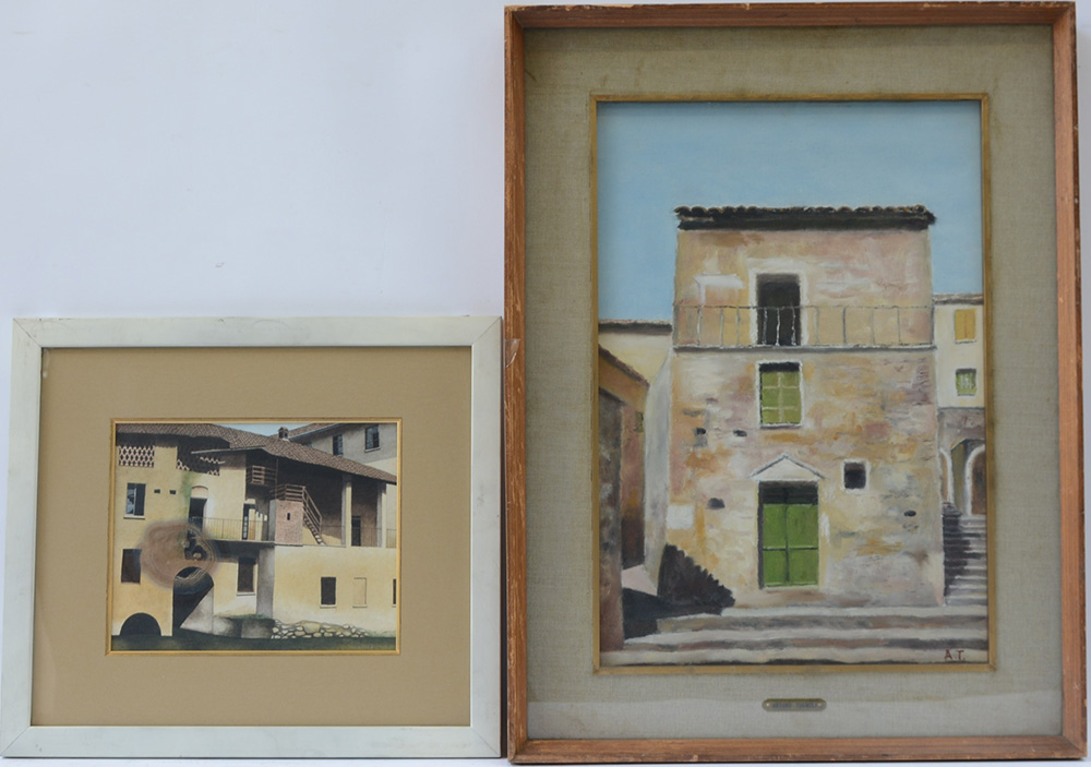Lotto composto da due dipinti raffiguranti case, di autori, tecniche e misure diverse. In cornici (gravi difetti)