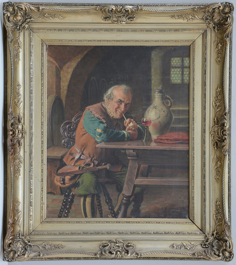 Emil Kuhlmann-Reher ( 1886- 1957)"Interno con fumatore" olio su tela (cm 60x50) firmato in basso a destra, in cornice (difetti)