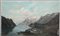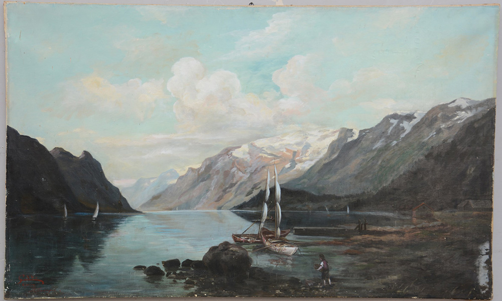 Ignoto sec XX. "Paesaggio lacustre con barche e pescatore" 1937 olio su tela (cm 90x150) reca firma indecifrata e la data XV in basso a sinistra (difetti)