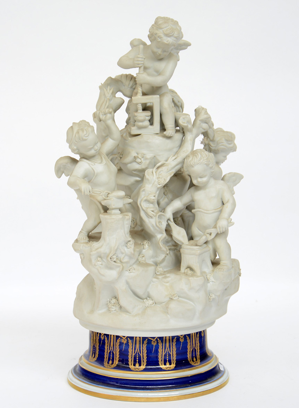 Manifattura di Sevres "Putti Allegorici", sec. XX. Gruppo scultoreo a bisquit su base in porcellana blu con fregi dorati.