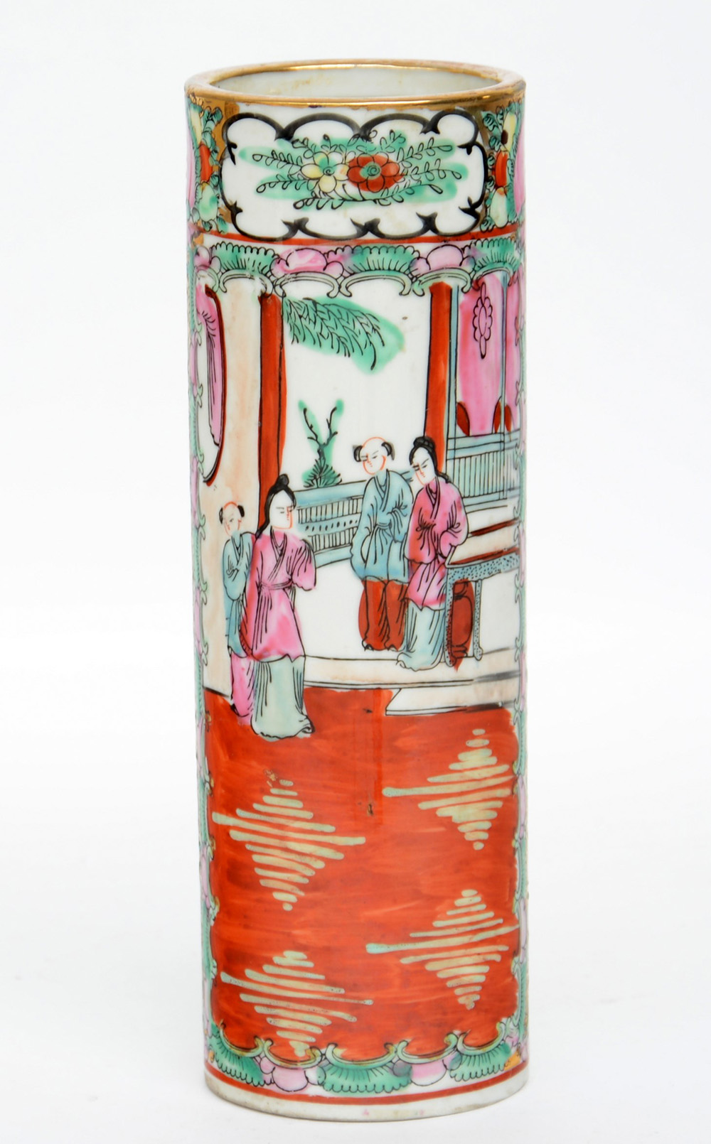 Lotto 294 | Vaso cilindrico in porcellana Famiglia Rosa, decorata con fiori e uccelli...