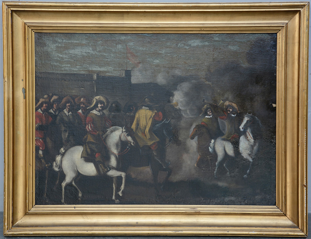 Ignoto "Scena dal Don Chisciotte" antico dipinto ad olio su tela (cm 72x100) in cornice (difetti e mancanze)