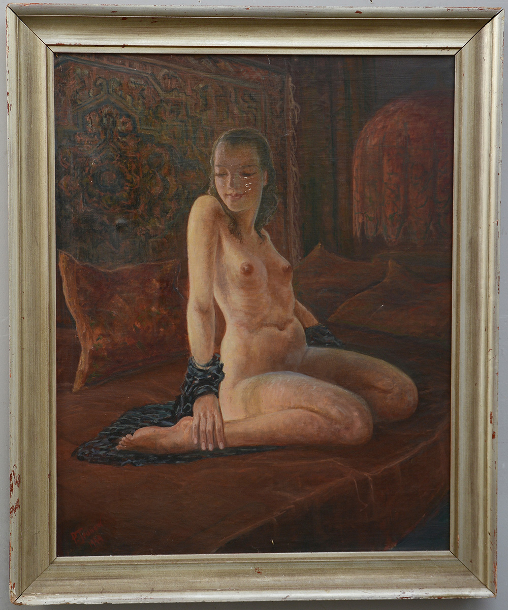 Ignoto sec XX. "Nudo femminile" 1944 olio su tela (cm 100x80) reca firma indecifrata e data in basso a sinistra, in cornice (difetti)