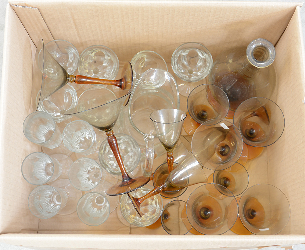 Cartone contenente parti due servizio di bicchieri: uno in cristallo con brocca per l'acqua, ed uno in cristallo color ambra con bottiglia (difetti)