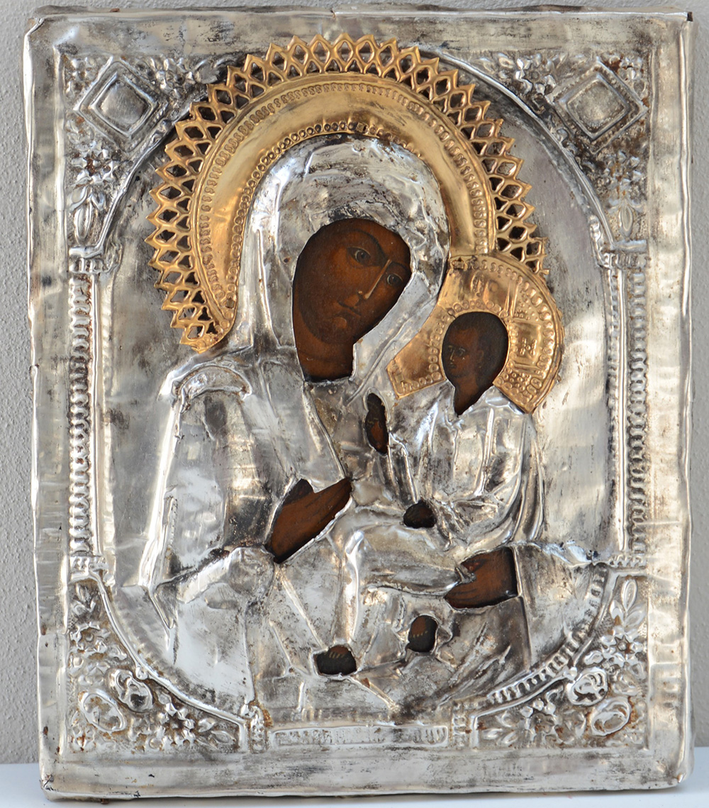 Lotto 317 | Icona raffigurante la Madonna col Bambino con riza in metallo argentato e...