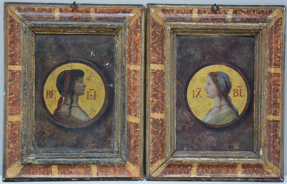 Coppia di antichi verre-paint raffiguranti ritratti femminili clipeati accompagnati da abbreviazioni latine, entro cornici laccate e dipinte ad effetto marmorizzato (vetri cm 23x16 circa) (difetti e restauri)