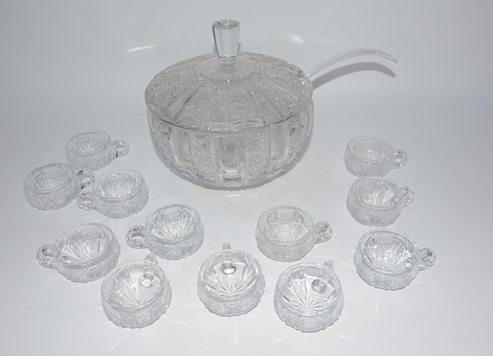 Servizio da macedonia in cristallo molato composto da una boule con mestolo e coperchio e dodici tazze con manico (difetti)