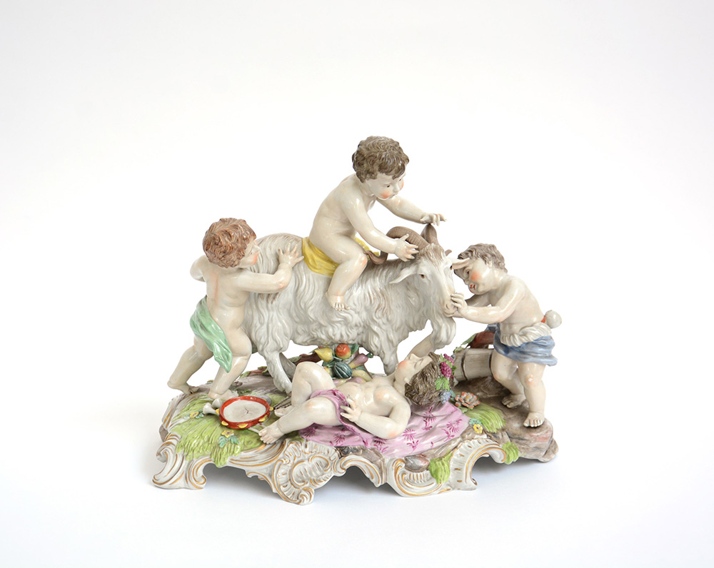 Gruppo in porcellana policroma raffigurante putti con caprone (cm 35x40) (difetti)