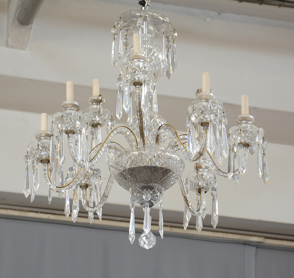 Lampadario a dieci fiamme in cristallo decorato da pendagli (h. cm 90) (difetti)
