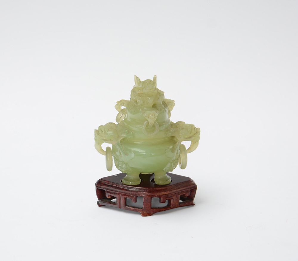 Piccolo incensiere tripode in pietra dura di colore verde con coperchio, anse a guisa di draghi e anelli (h cm 10)base in legno, cina secolo XX