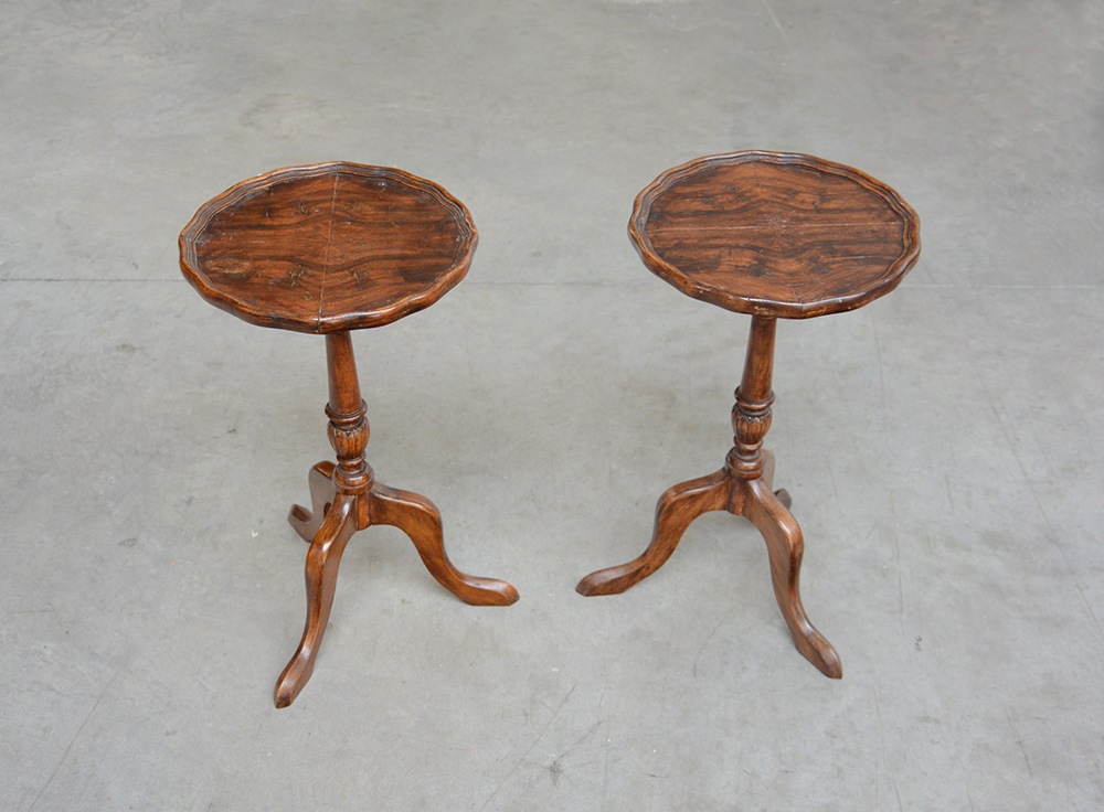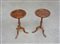 Coppia di tavolini d'appoggio con pianetti sagomati e gamba centrale a colonna terminanti a tre piedi mossi (h 52x d 30)