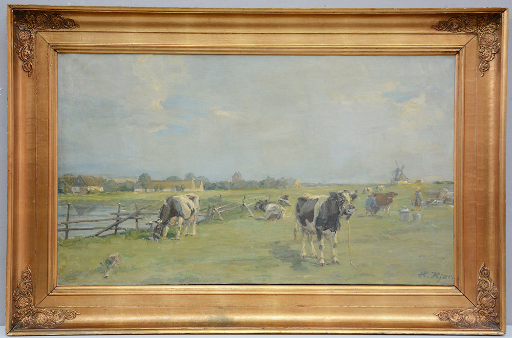 Firma indecifrata "Mucche al pascolo" olio su tela (cm 57x97) firmato in basso a destra, in cornice (difetti)