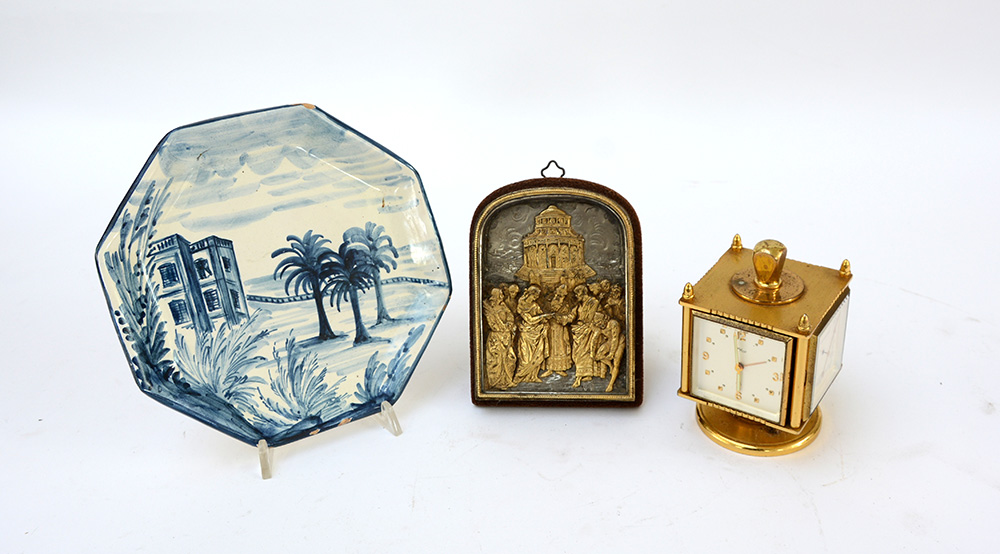 Lotto composto da un piatto, un barometro-termometro-orologio da tavolo e un'icona in lamina d'argento
