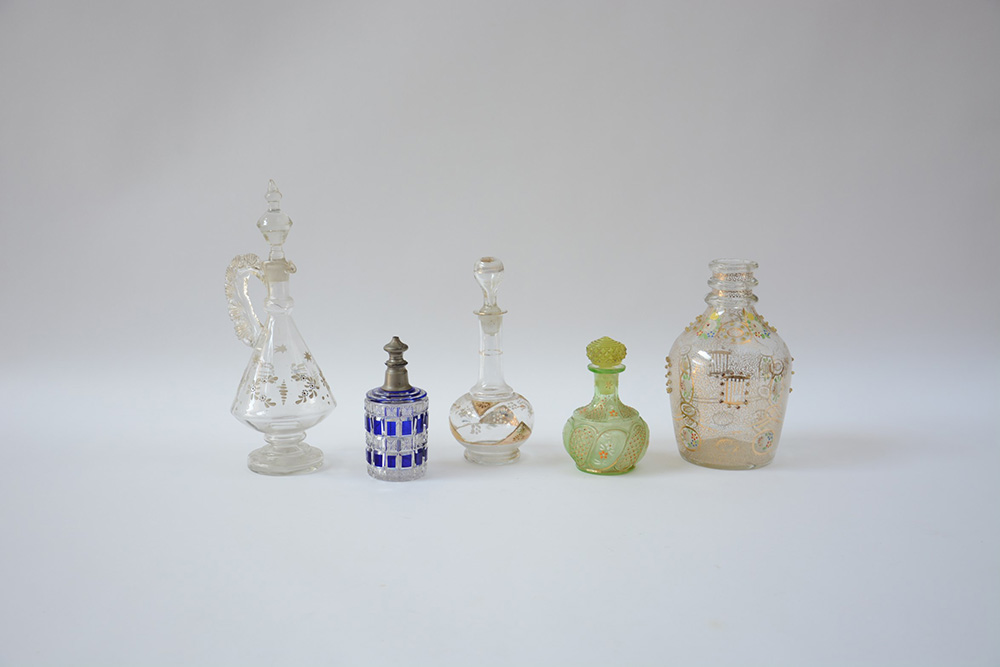 Lotto composto da cinque bottigliette in vetro di fatture e decori differenti (lievi difetti)