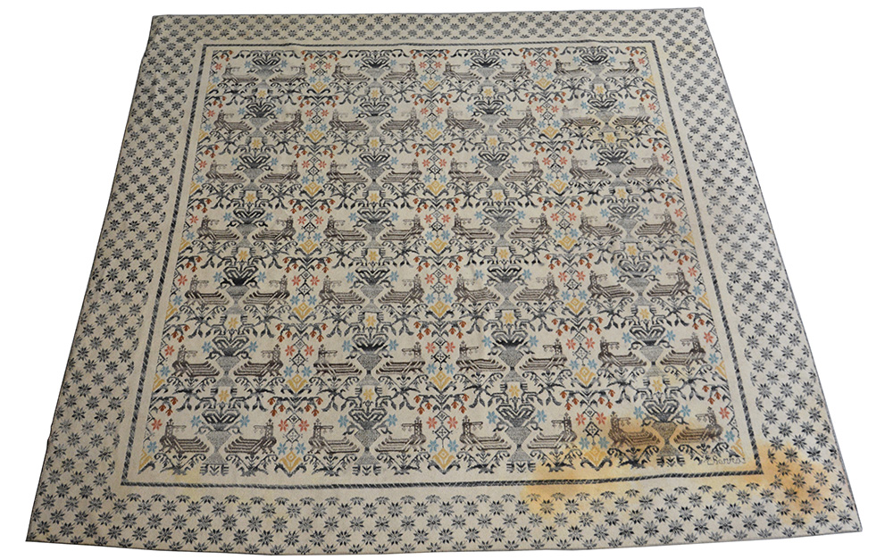 Tappeto sardo, sec. XX. Lavorato con tecnica bouclé in lana, decorato con motivo ripetuto geometrico con uccelli, vasi e rami fioriti (cm 292x310) (difetti)