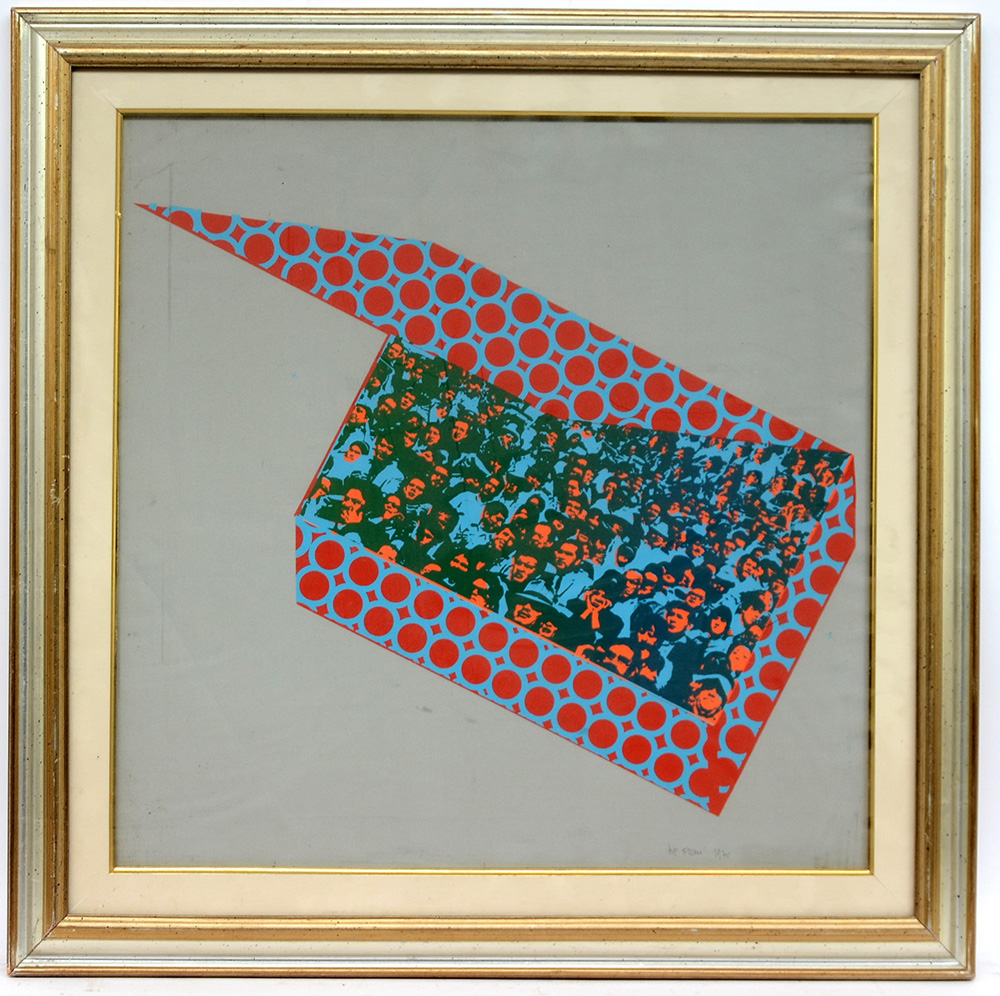 Firma indecifrata, "Composizione con folla", serigrafia su tela (cm 50x50) firmata e datata 1970 in basso a destra, in cornice (lievi difetti)