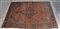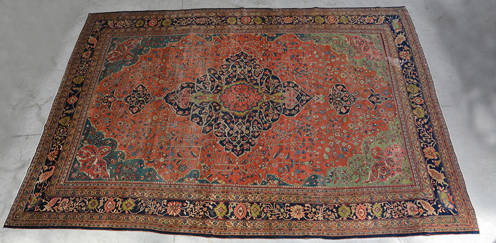 Tappeto Sarouk, Persia seconda metà del sec XIX. Disegno a medaglione e due puntali a fondo blu su campo color corallo scuro, angolari verdi, bordura fondo blu notte con disegni Herati (cm 438X320) (difetti e restauri)