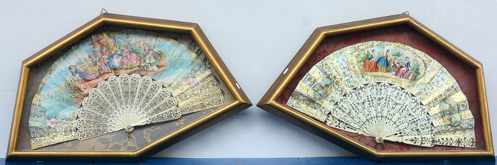 Lotto composto da due ventagli con stecche in avorio decorati con scene di vita in abiti settecenteschi, In cornice in legno dorato, secolo XIX (difetti)