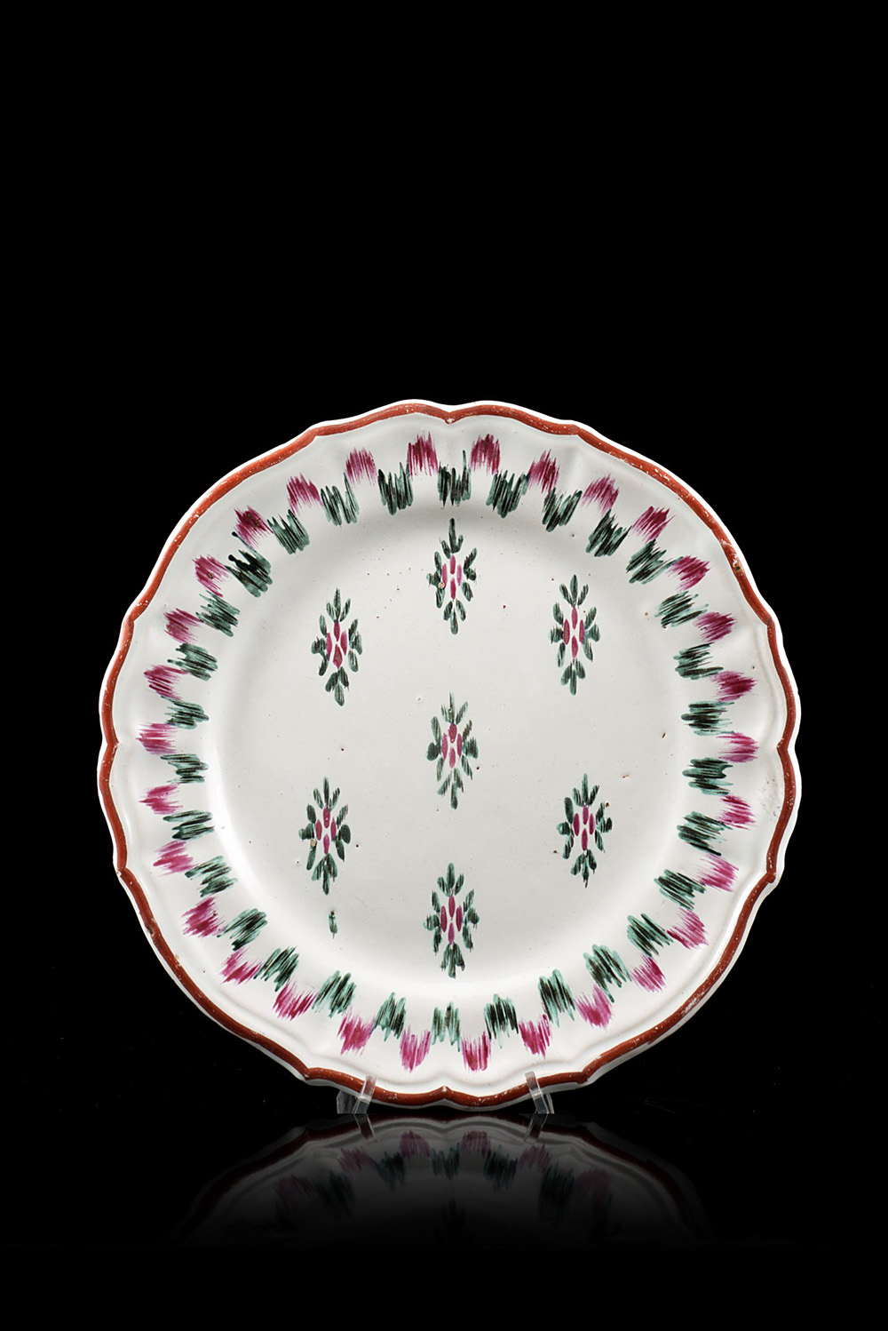 Piatto in maiolica con decoro a terzo fuoco in rosso e verde ‘alla fiamma’. Milano, sec. XVIII (minime sbeccature)