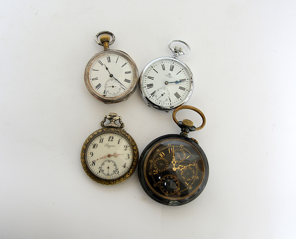 Lotto composto da quattro orologi da tasca da uomo in argento e metallo, misure diverse (difetti)
