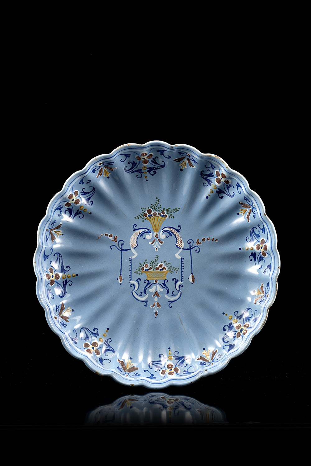 Crespina a parete baccellata con bordo lobato, base apoda, in maiolica foggiata a stampo. Decoro policromo alla ‘Berain’ su smalto berettino. Pavia, inizio sec. XVIII (d. cm 27) (lievi difetti)