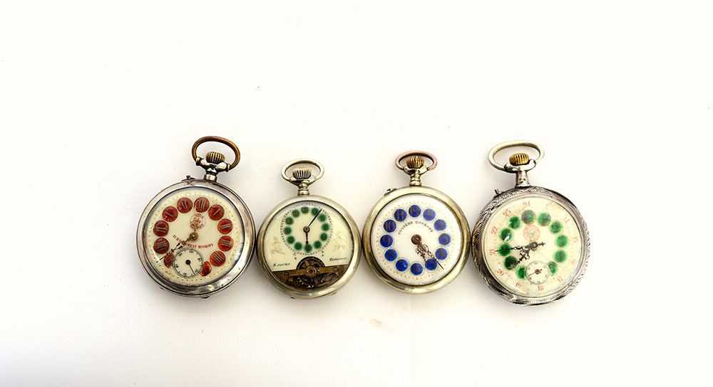 Lotto composto da quattro orologi da tasca in argento e metallo con cartuches di vari colori (difetti)