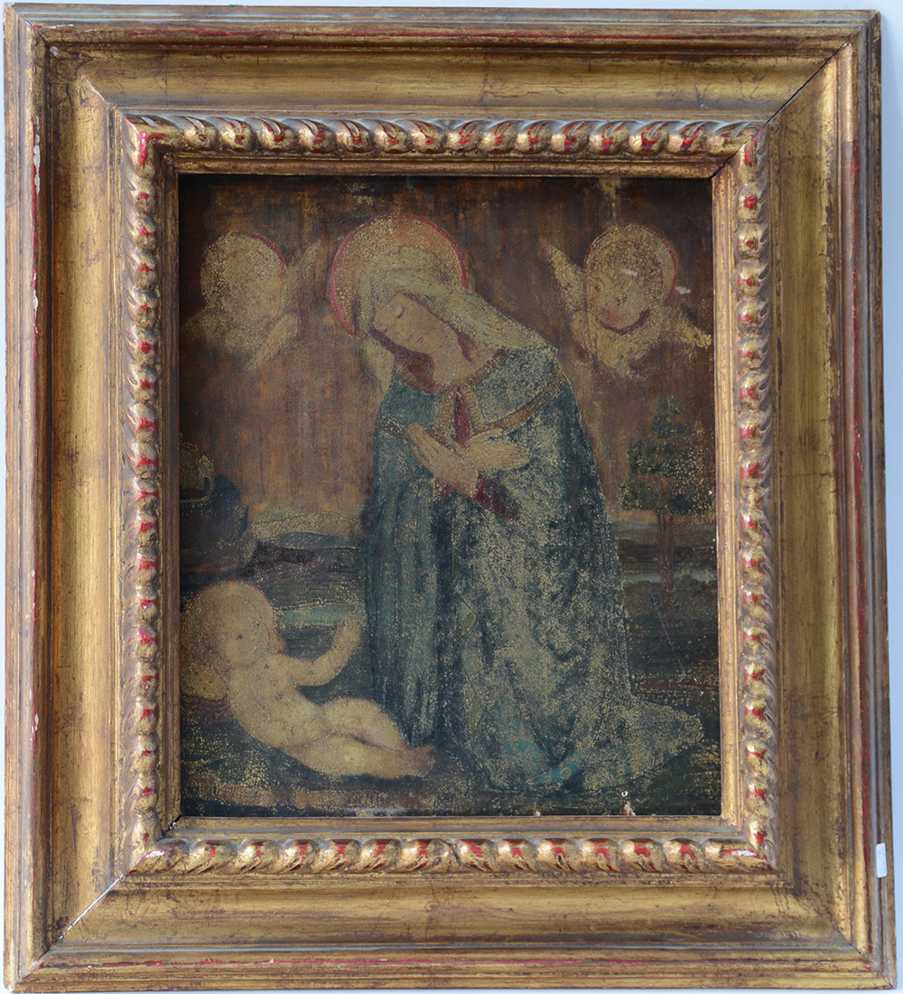 Ignoto "Madonna con bambino e cherubini" dipinto su tavola (cm 32x28) in cornice (difetti)