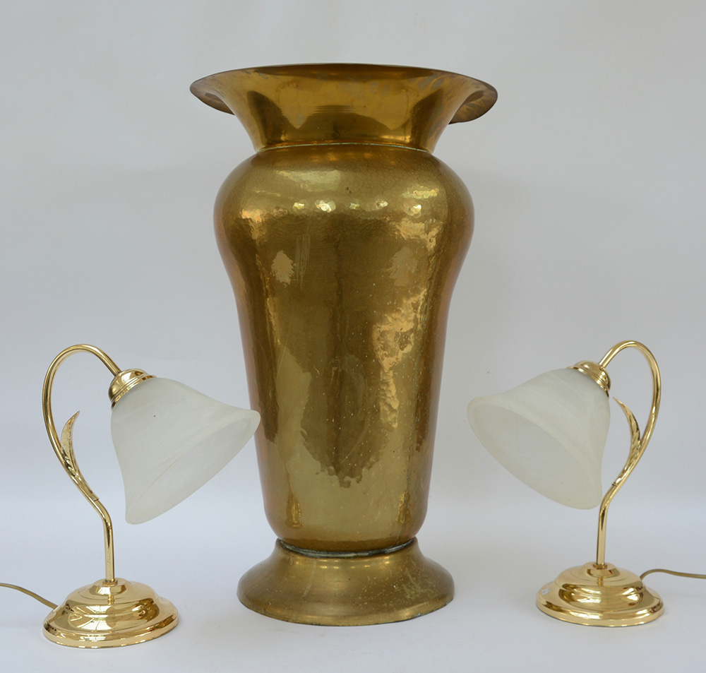 Lotto composto da un vaso portaombrelli e due lampade in metallo e vetro