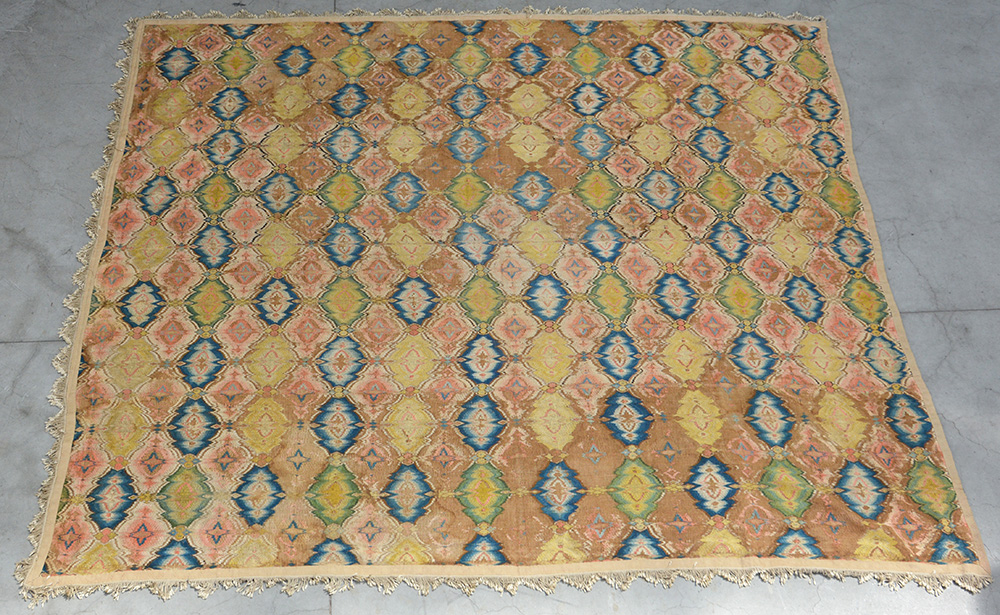 Arazzo. Ricamo in seta sfioccata policroma con tecnica "point d'Hongrie" su canovaccio in lino. Disegno "all-over" con formelle e losanghe. Europa, sec. XVII (cm 290x265) (gravi mancanze)