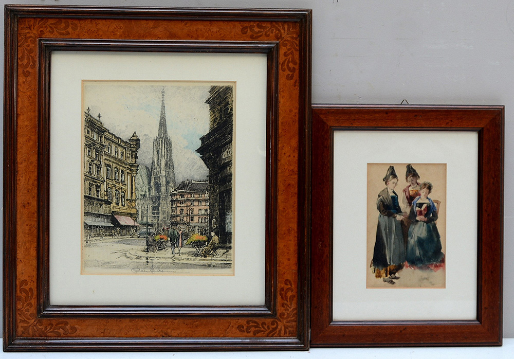 Lotto composto da un'acquatinta raffigurante uno scorcio di città e un acquerello ritraente tre donne impegnate nella lettura (cm 26x20 e 17x11), in cornici (lievi difetti)