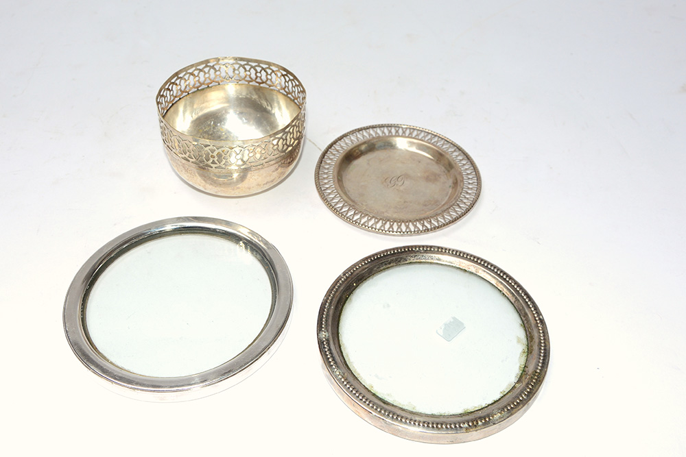 Lotto composto da un piattino in argento; una ciotola e due sottobottiglia in...